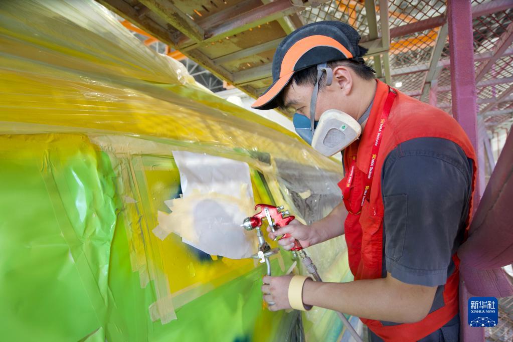 6月15日,海航斯提斯噴漆作業(yè)員在噴涂機身圖案。