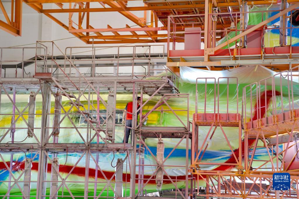 6月15日,海航斯提斯噴漆作業(yè)員在噴涂機身圖案。