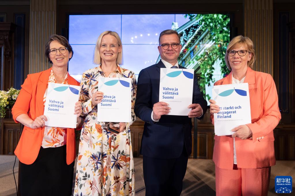 6月16日,芬蘭新聯(lián)合政府的四個(gè)政黨黨首(左起:基督教民主黨、芬蘭人黨、民族聯(lián)合黨、瑞典族人民黨)在芬蘭赫爾辛基舉行記者會(huì ),公布施政綱領(lǐng)。