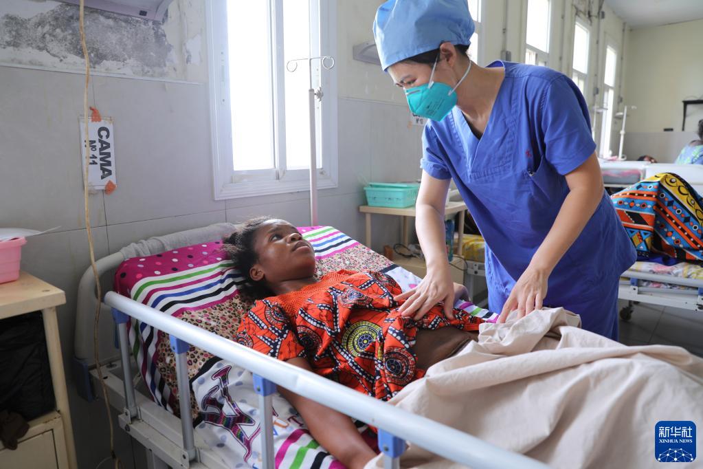 6月14日,在赤道幾內亞首都馬拉博的馬拉博地區醫院,中國醫療隊婦產(chǎn)科醫生王偉偉為產(chǎn)婦檢查。