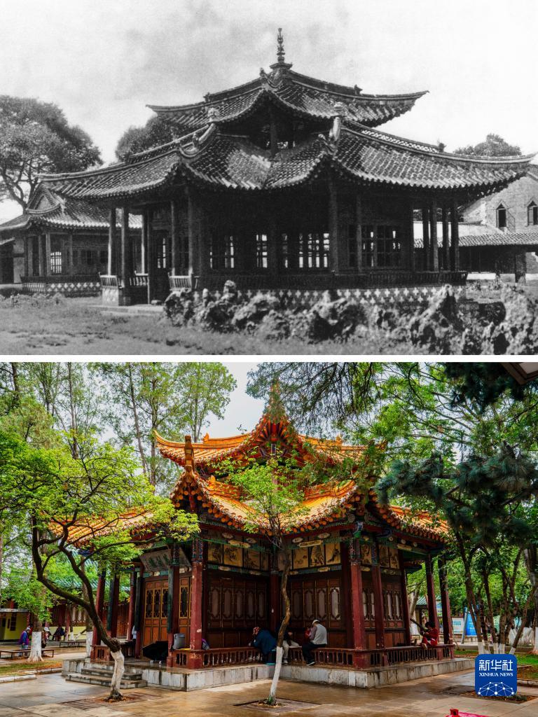 下圖為如今大觀(guān)公園內綠樹(shù)掩映下的涌月亭(6月15日攝)。新華社記者江文耀攝