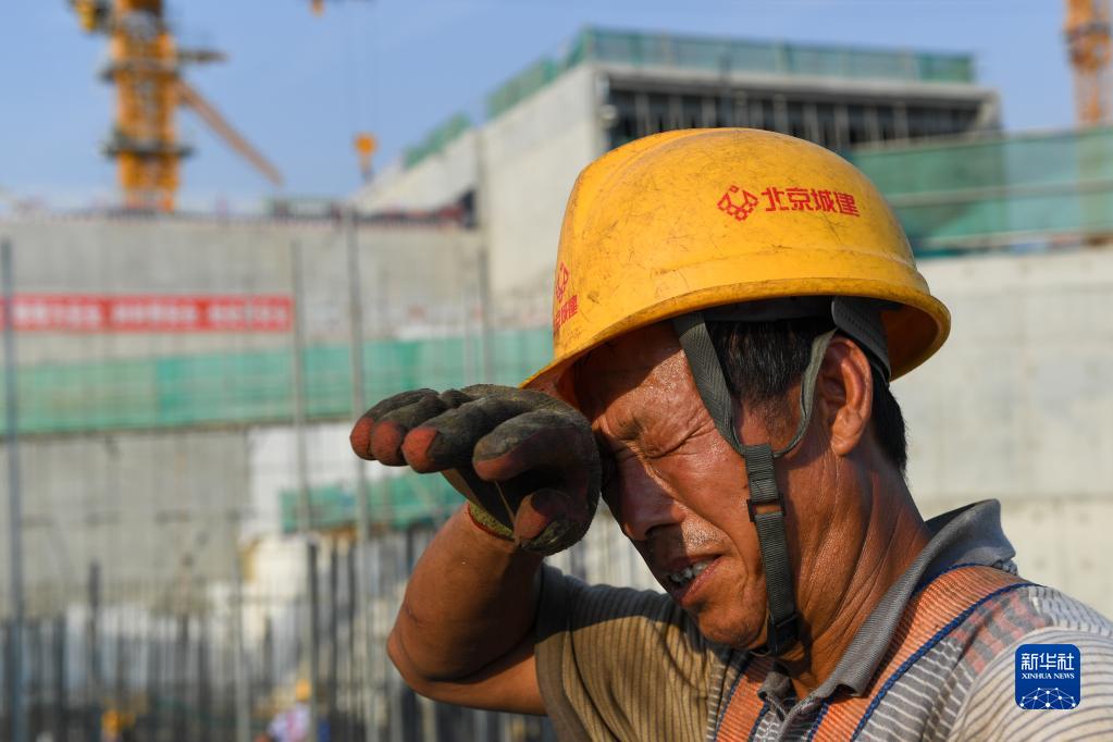 6月16日,在北京城市副中心站綜合交通樞紐項目02標段北京城建施工現場(chǎng),工人在擦拭汗水。為了應對高溫天氣,工地已調整作息時(shí)間,施工時(shí)間避開(kāi)了中午高溫時(shí)段。