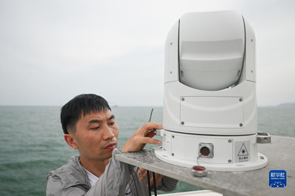 測試開(kāi)始前,工作人員在“電科1號”綜合試驗船上安裝高清光電設備(6月14日攝)。