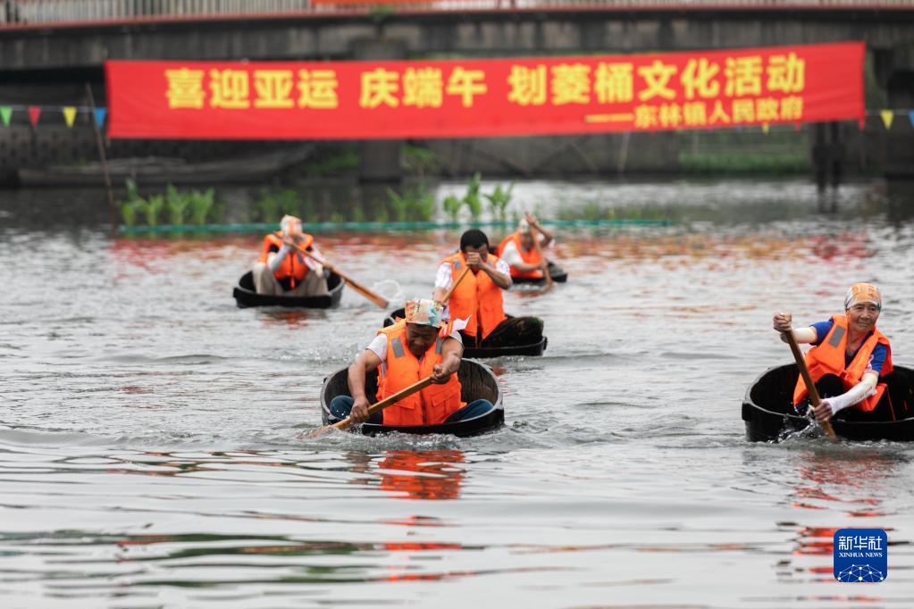當日,浙江省湖州市吳興區東林鎮舉辦“慶端午 劃菱桶”趣味系列活動(dòng),來(lái)自各村的30多名選手一人一桶在泉益村的河塘里競相追逐,熱鬧非凡?;顒?dòng)現場(chǎng)還設有射五毒、做香囊、包粽子、做艾草花束等活動(dòng),讓百姓和游客在觀(guān)賞精彩比賽的同時(shí)了解特色端午習俗。