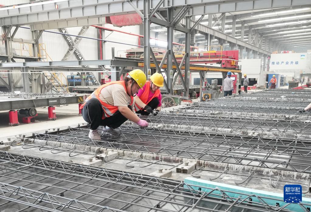 6月17日,工人在秦皇島市撫寧區一家裝配式建筑企業(yè)的生產(chǎn)車(chē)間綁扎預制鋼筋混凝土墻體的鋼筋骨架。