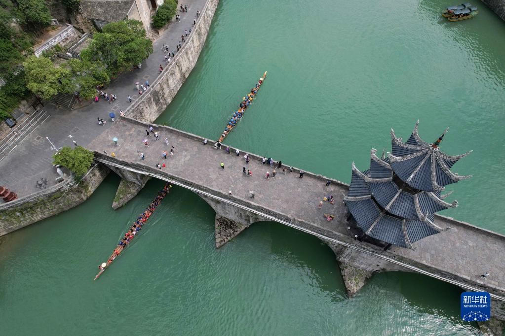 6月17日,游客在鎮遠古城?陽(yáng)河畔體驗劃龍舟(無(wú)人機照片)。