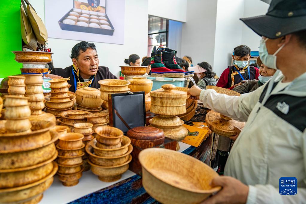 6月17日,工作人員在第五屆藏博會(huì )現場(chǎng)為顧客介紹木碗產(chǎn)品。