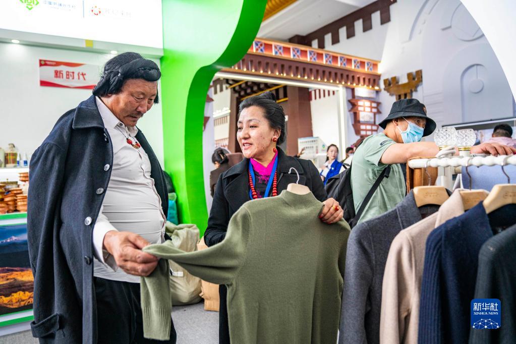 6月17日,工作人員在第五屆藏博會(huì )現場(chǎng)向顧客介紹產(chǎn)自阿里地區的羊絨衫產(chǎn)品。