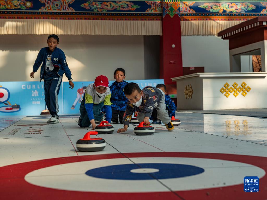 6月17日,幾名孩子在第五屆藏博會(huì )現場(chǎng)體驗冰壺。
