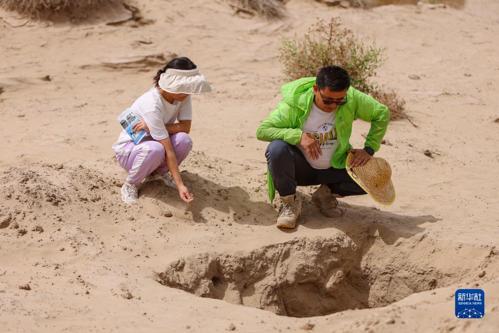 在中科院新疆生態(tài)與地理研究所策勒沙漠研究站天然試驗區,買(mǎi)爾當和學(xué)生查看土地刨面,準備進(jìn)行取樣(6月12日攝)。新華社記者 郝昭 攝