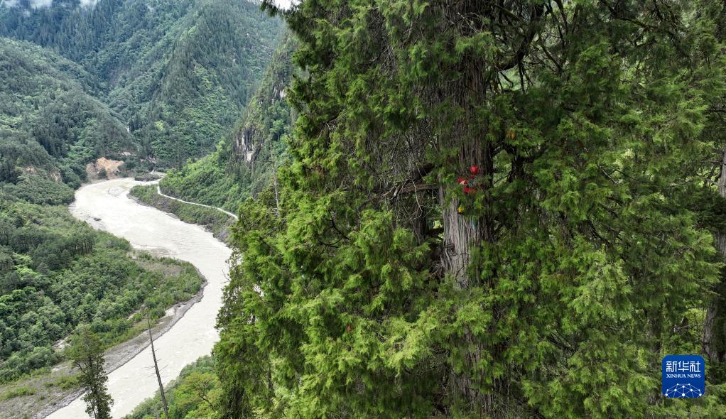 6月15日,攀樹(shù)專(zhuān)家劉團璽在攀爬亞洲第一高樹(shù)(無(wú)人機照片)。新華社記者 晉美多吉 攝