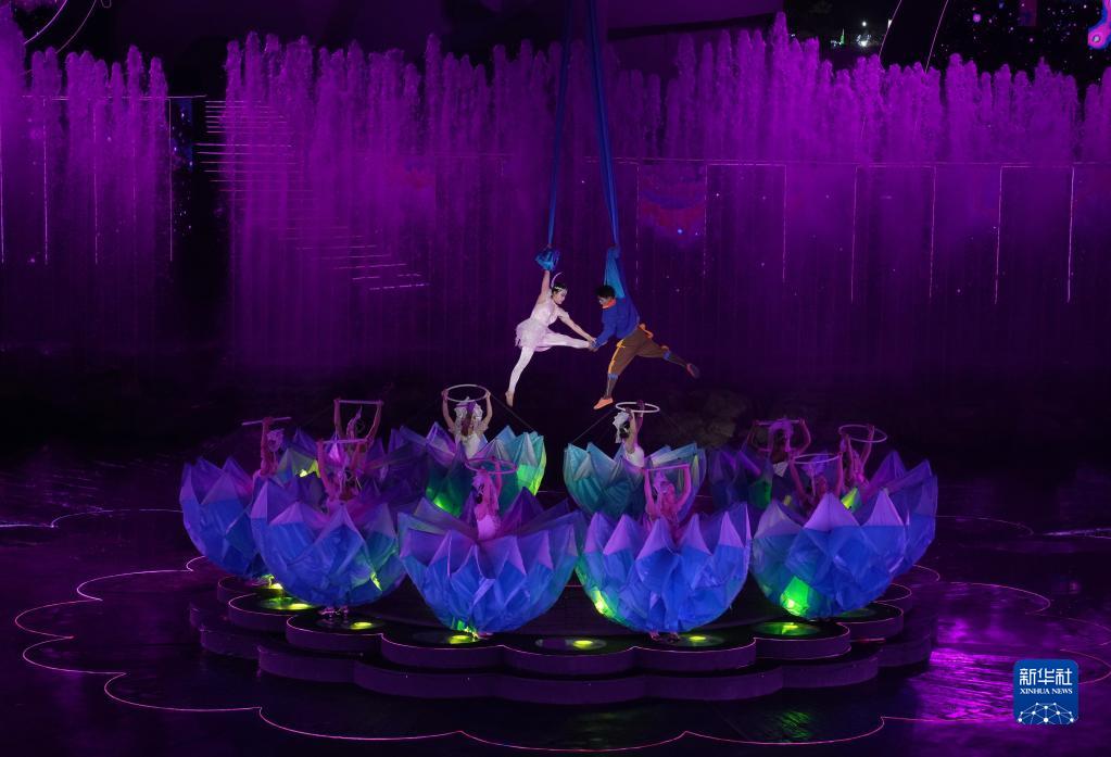 6月17日,在秦皇島市北戴河區碧螺塔酒吧公園,演員為游客表演海上實(shí)景奇幻秀《塔秀》。