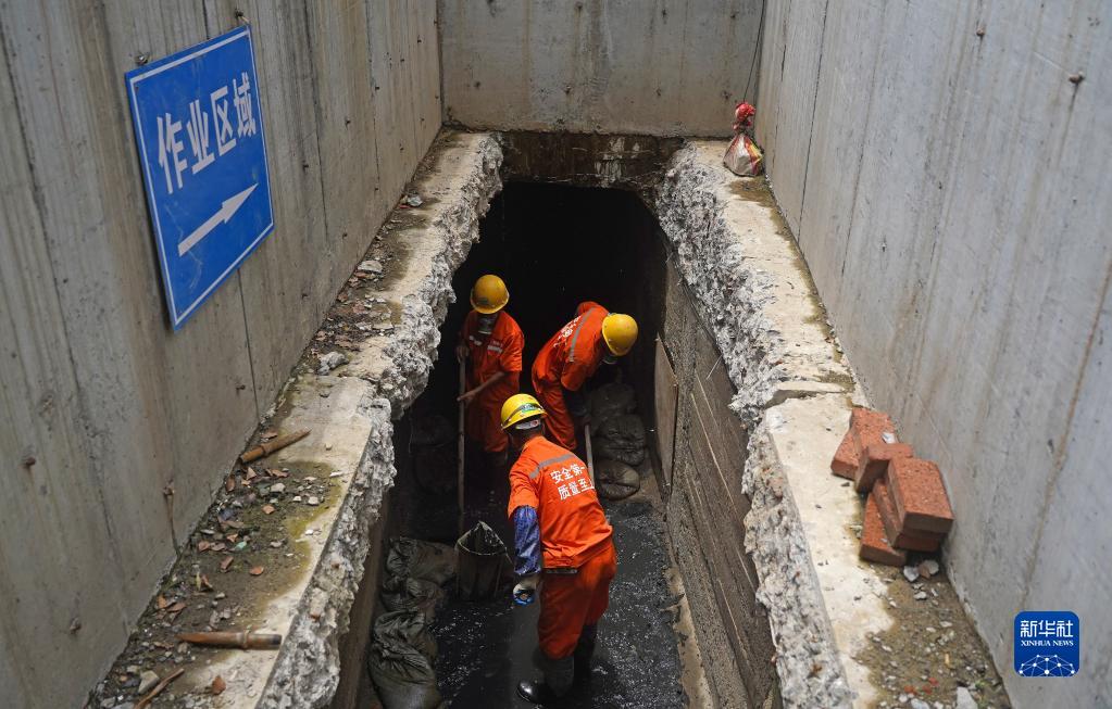 在九江市潯陽(yáng)區的一處工地,中鐵四局的施工人員進(jìn)行排水管網(wǎng)的清淤工作(6月15日攝)。