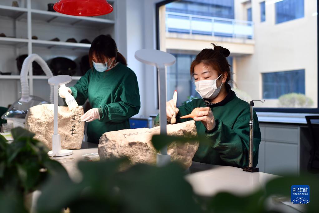 在山西大同云岡石窟研究院可移動(dòng)文物修復室,工作人員在進(jìn)行除塵作業(yè)(2021年5月8日攝)。