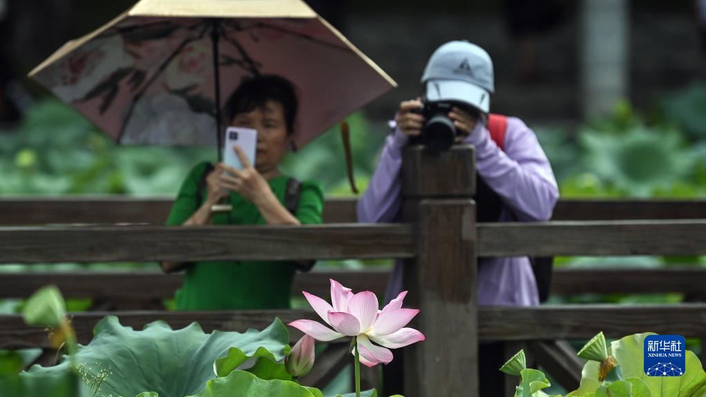 連日來(lái),廣西南寧南湖公園荷花盛開(kāi),吸引眾多市民和游客前來(lái)觀(guān)賞。