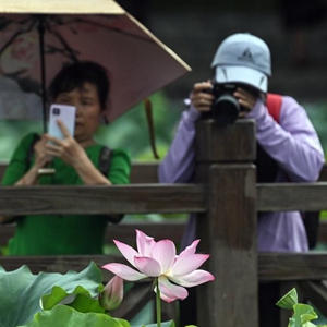 6月18日,在南寧市南湖公園荷花池,觀(guān)眾在拍攝荷花。