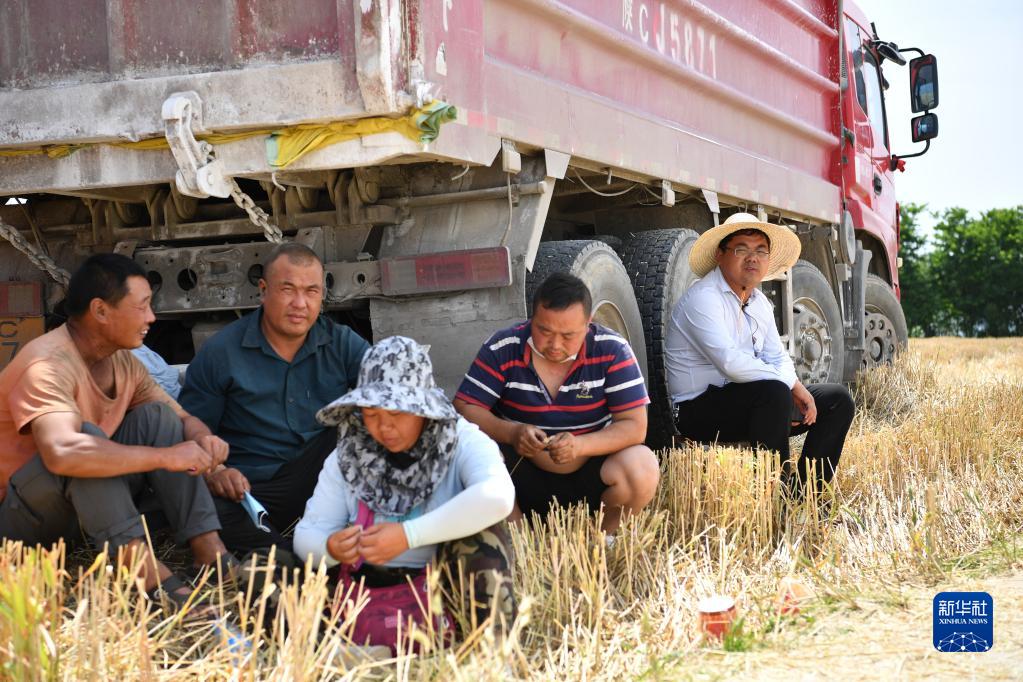 6月8日,薛強(右一)與合作社社員們在收割小麥間隙歇息。