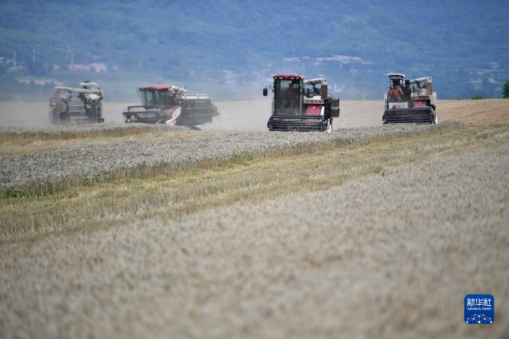 6月8日,長(cháng)豐農機專(zhuān)業(yè)合作社社員駕駛收割機在西安市長(cháng)安區神禾塬萬(wàn)畝優(yōu)質(zhì)糧食生產(chǎn)基地內搶收小麥。