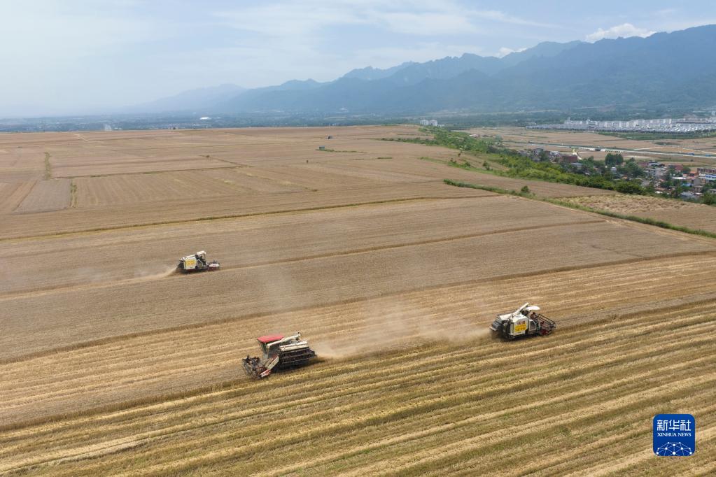 6月8日,長(cháng)豐農機專(zhuān)業(yè)合作社的收割機在西安市長(cháng)安區神禾塬萬(wàn)畝優(yōu)質(zhì)糧食生產(chǎn)基地內搶收小麥。