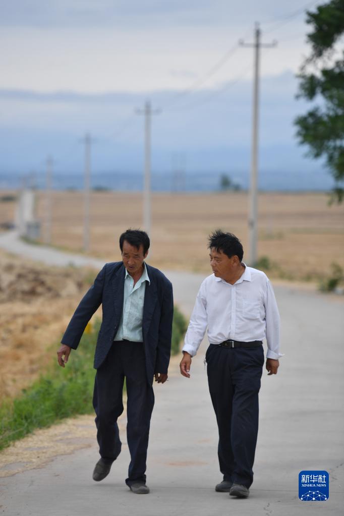 6月16日,薛拓(右)與合作社的土地托管員在一條生產(chǎn)路上邊走邊交流。