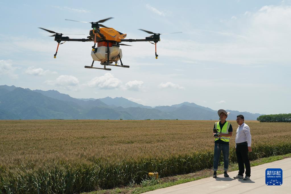 5月30日,薛強(右)在麥田旁查看合作社農機手操作植保無(wú)人機作業(yè)。