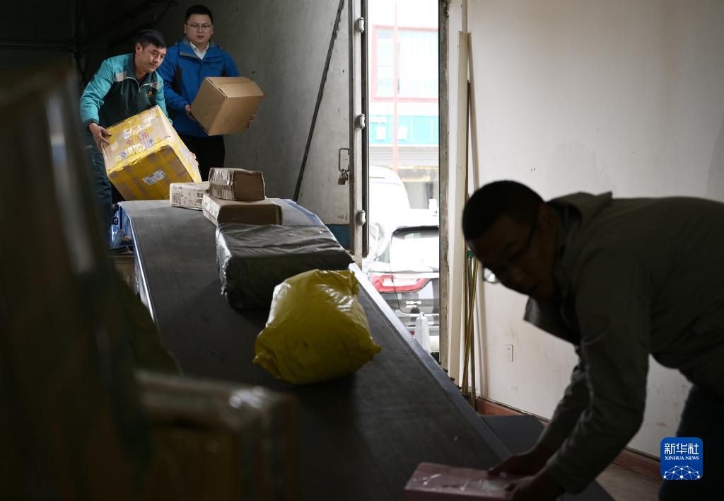 在唐克鎮快遞物流運營(yíng)中心,哈弄奪機(左)和同事一起卸車(chē)(6月15日攝)。