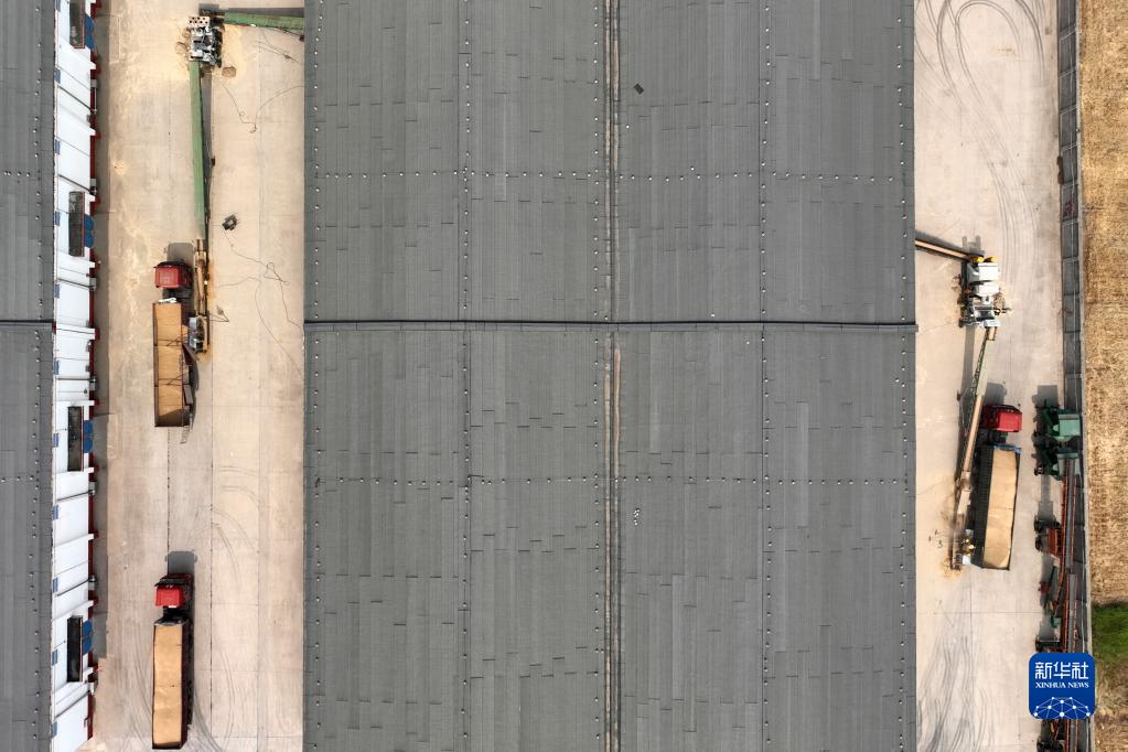6月18日,在位于柏鄉縣的河北柏糧糧食儲備集團有限公司,工人在卸載收購的小麥(無(wú)人機照片)。