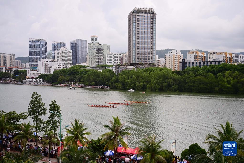 6月18日,龍舟隊在海南省三亞市三亞河上進(jìn)行比賽。