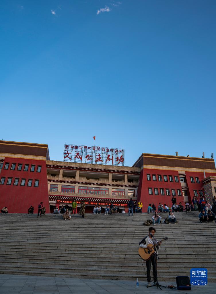 在文成公主劇場(chǎng)前,一名街頭藝人表演吉他彈唱(6月6日攝)。