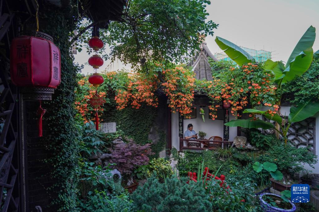揚州市民杜祥開(kāi)用自家平房與天井打造出“祥廬”,小橋流水,亭臺假山,錦魚(yú)暢游,匾額楹聯(lián)(6月14日攝)。