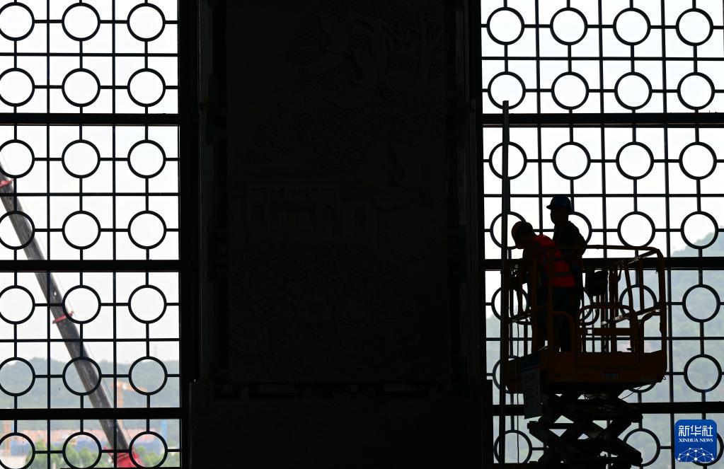 6月19日,工人在福廈高鐵新建廈門(mén)北站外立面安裝具閩南傳統風(fēng)格的窗花構件。