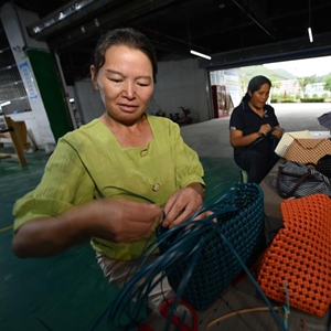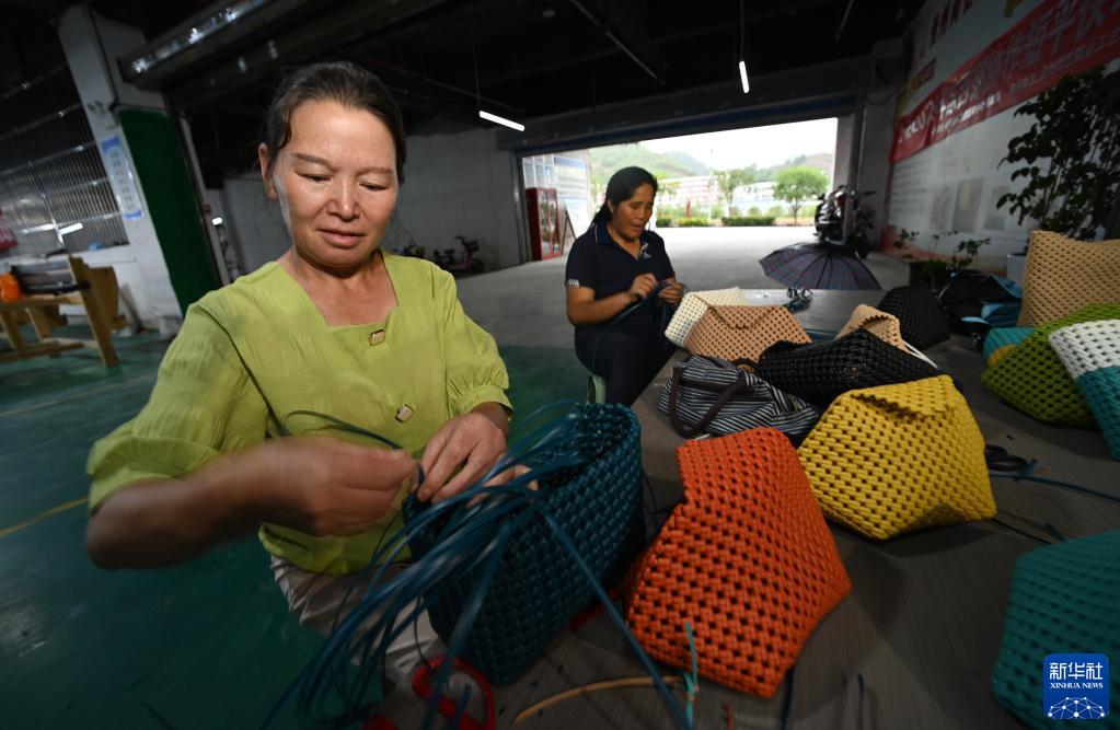 6月19日,村民在貴州省劍河縣幸福社區幫扶車(chē)間編織藤編包。