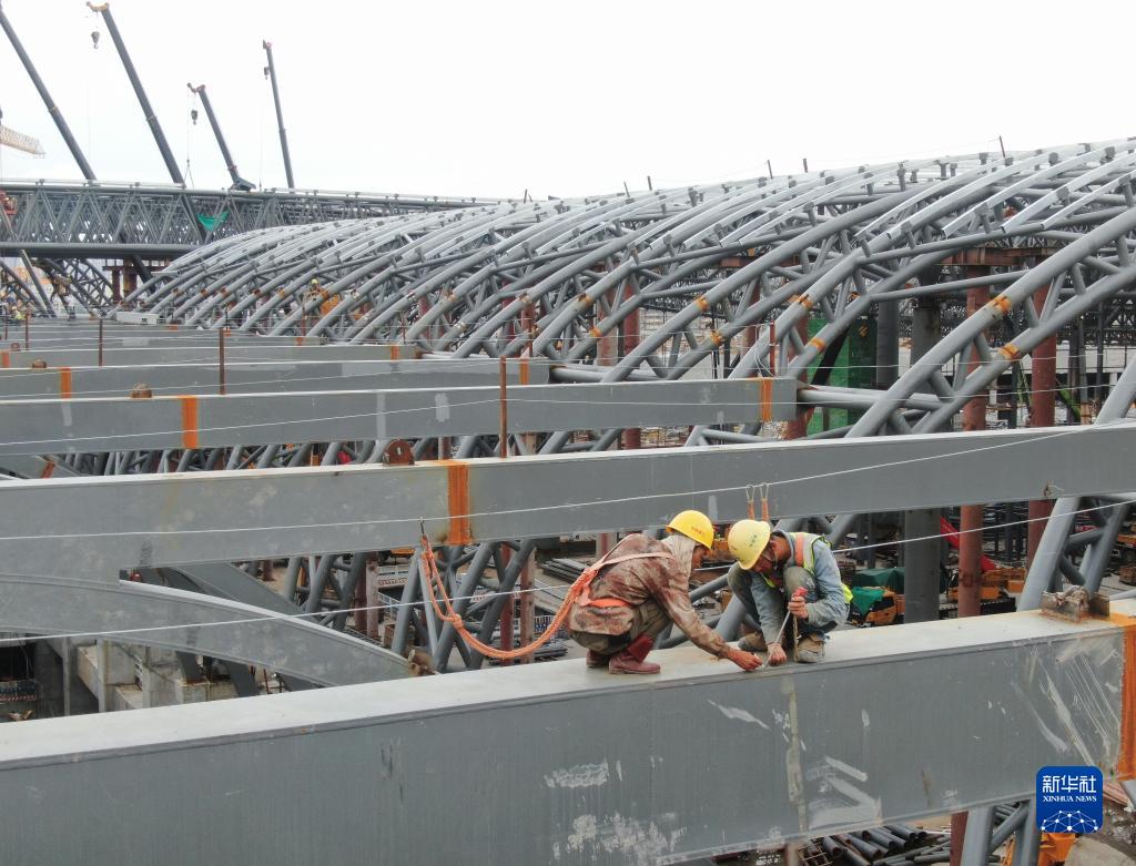 6月19日,工人在廣州白云火車(chē)站鋼結構框架上施工作業(yè)(無(wú)人機照片)。