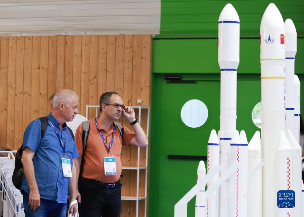 6月19日,在法國巴黎近郊的布爾歇機場(chǎng)舉行的巴黎航展上,參觀(guān)者關(guān)注中國航天科技集團有限公司展出的長(cháng)征系列運載火箭。