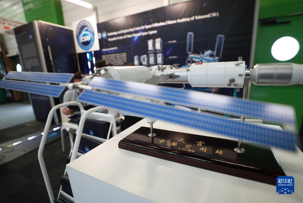 這是6月19日在法國巴黎近郊的布爾歇機場(chǎng)舉行的巴黎航展上拍攝的中國科學(xué)院空間應用工程與技術(shù)中心展臺。