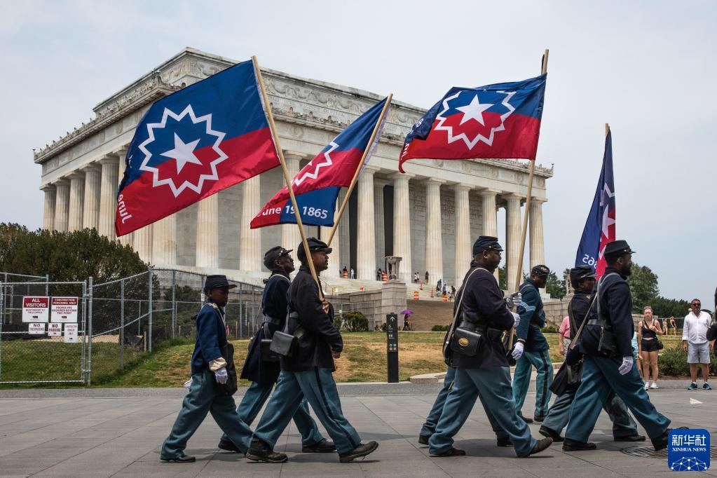 6月19日,在美國首都華盛頓的林肯紀念堂附近,人們扮演成南北戰爭時(shí)期的士兵,紀念黑奴解放日。