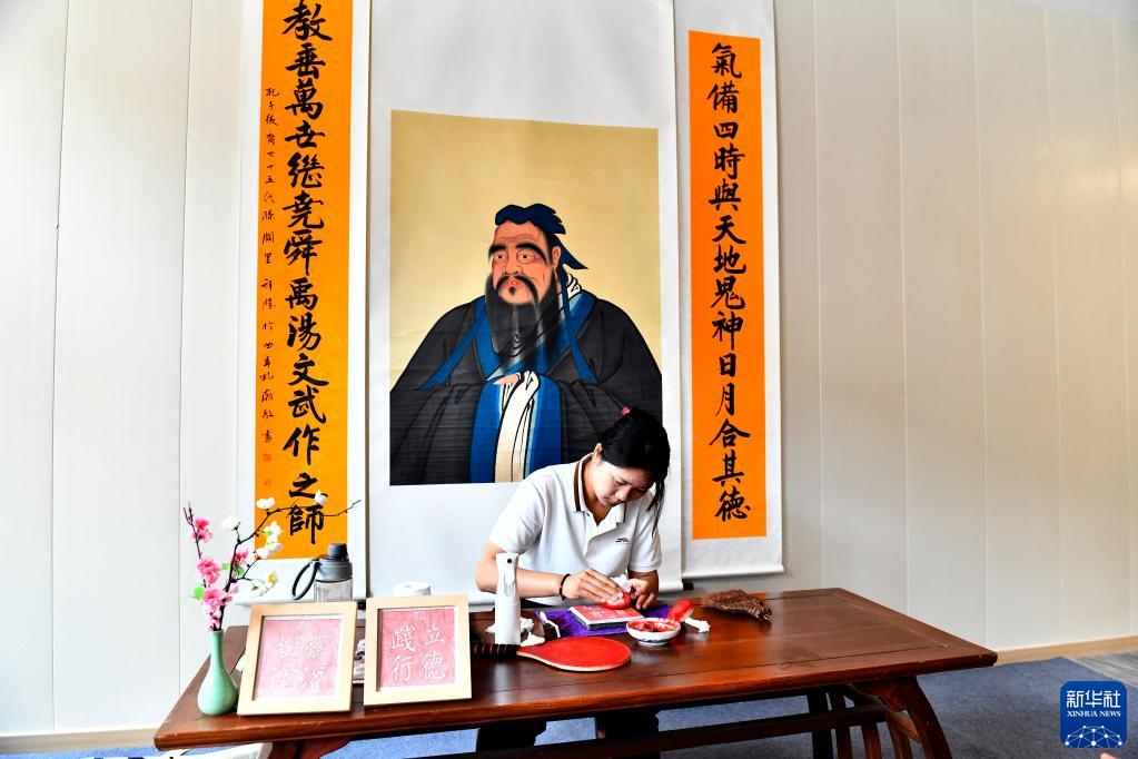 在曲阜市尼山腳下的魯源新村文化街區,工作人員在制作拓片(2023年6月8日攝)。