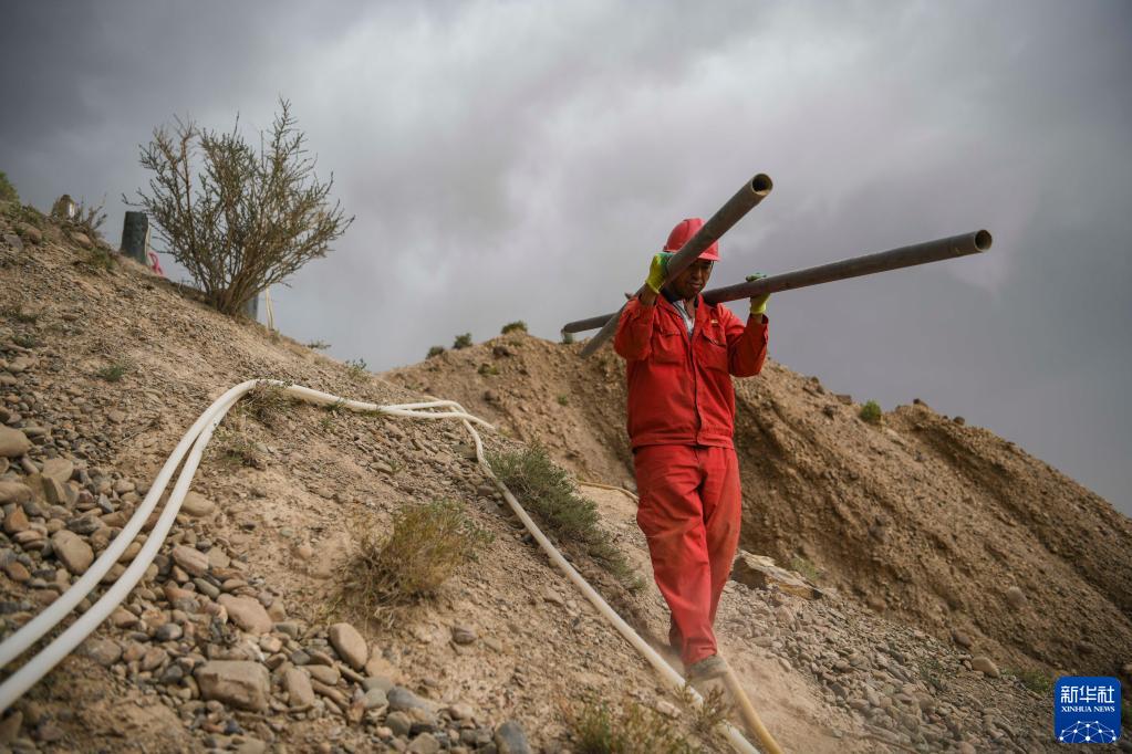 東方物探公司塔里木物探處2170隊的鉆工陳新志扛著(zhù)鉆桿快步走在山坡上,趕往下一個(gè)鉆井點(diǎn)位(6月18日攝)。新華社記者 胡虎虎 攝