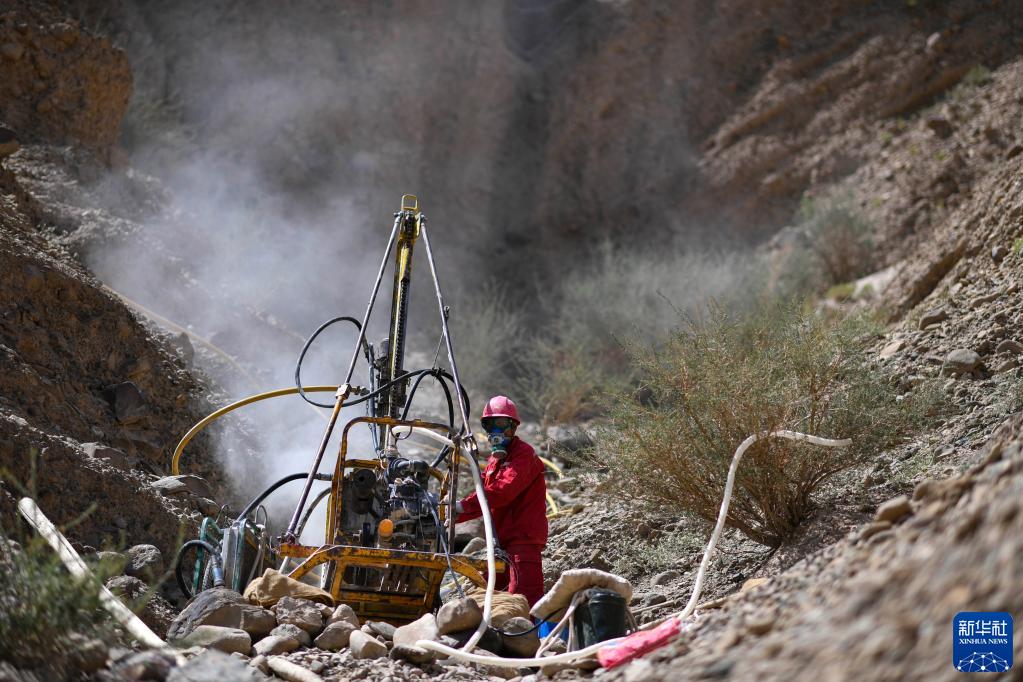 東方物探公司塔里木物探處2170隊鉆井組55歲的司鉆李事全在山間操作鉆機(6月18日攝)。新華社記者 胡虎虎 攝