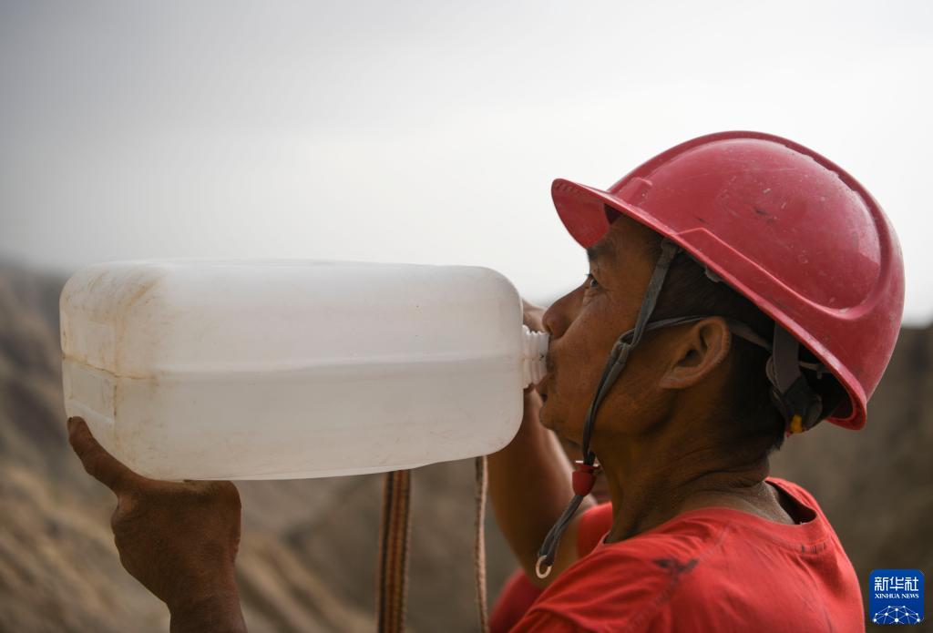 東方物探公司塔里木物探處2170隊的鉆工在山間休息時(shí)喝水(6月18日攝)。新華社記者 胡虎虎 攝