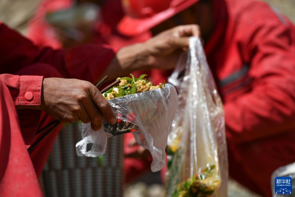 東方物探公司塔里木物探處2170隊的鉆工在山間工地上吃午飯(6月18日攝)。新華社記者 胡虎虎 攝