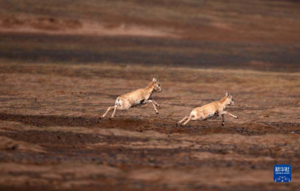兩只藏羚羊在可可西里卓乃湖區域活動(dòng)(6月17日攝)。