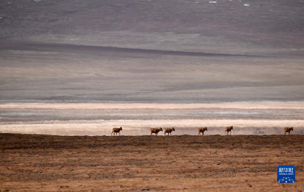 一群藏羚羊在可可西里卓乃湖區域活動(dòng)(6月17日攝)。