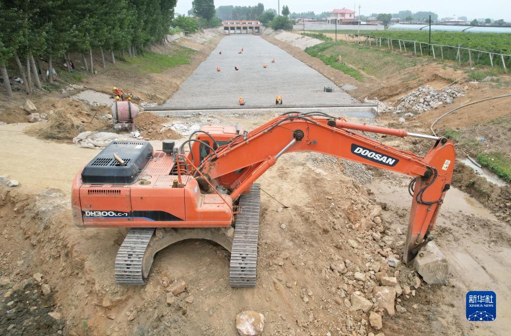 6月20日,工人在河北省盧龍縣木井鎮境內的龍鳳河水生態(tài)治理工程工地施工(無(wú)人機照片)。