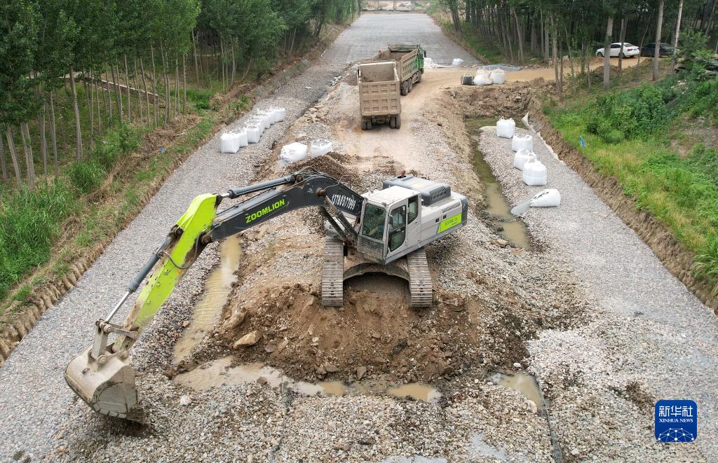 6月20日,工人在河北省盧龍縣木井鎮境內的龍鳳河水生態(tài)治理工程工地操作機械設備施工(無(wú)人機照片)。