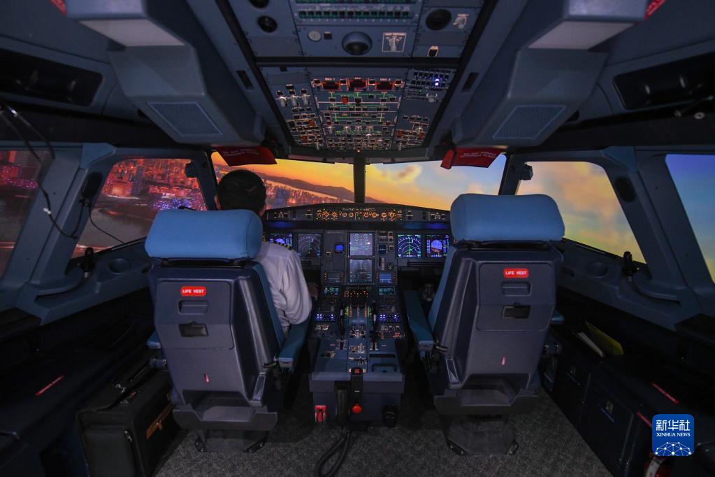 在廣東珠海翔翼飛行訓練中心,飛行員在模擬機中模擬飛越深圳城市上空(6月13日攝)。