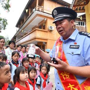 6月20日,在廣西融水苗族自治縣桿洞鄉烏英苗寨,民警介紹禁毒知識。
