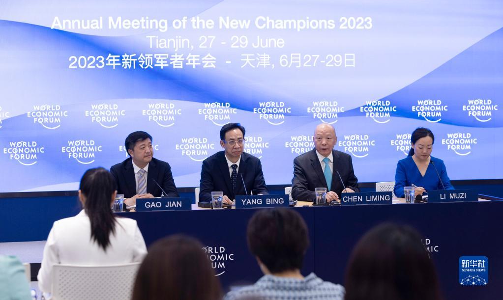 6月20日,國家發(fā)展和改革委員會(huì )國際司副司長(cháng)高?。ㄗ笠唬?、天津市副市長(cháng)楊兵(左二)、世界經(jīng)濟論壇大中華區主席陳黎明(右二)出席新聞發(fā)布會(huì )。