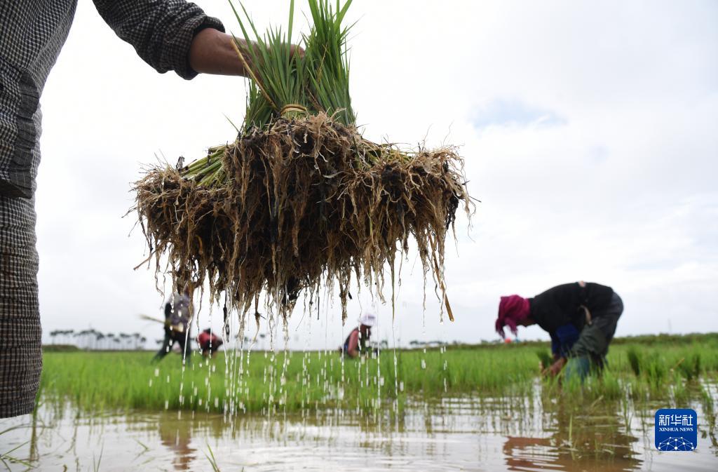 6月20日,在云南省麗江市古城區大研街道文智社區,農民在拔水稻秧苗,準備移栽。
