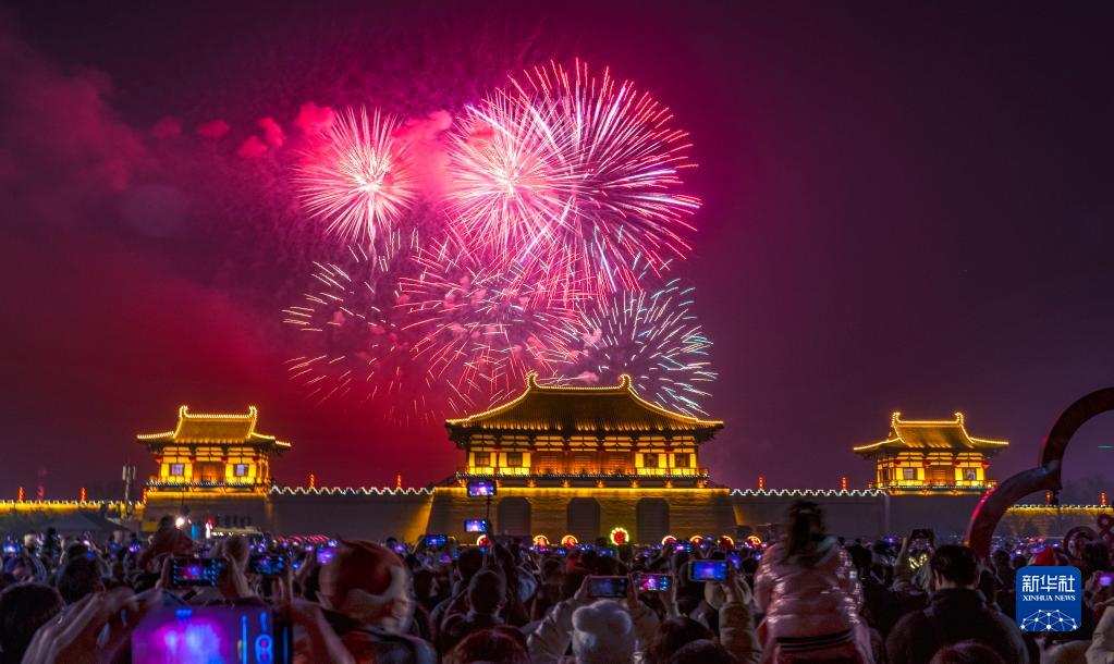 市民在洛陽(yáng)市洛龍區定鼎門(mén)廣場(chǎng)觀(guān)賞焰火晚會(huì )(2023年1月22日攝)。
